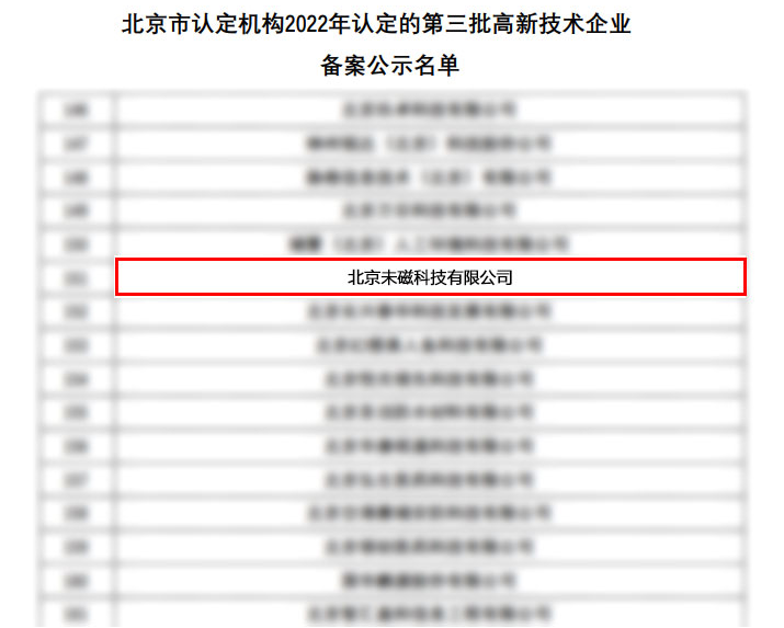 近日,科技部高新技术企业认定管理工作网发布《关于对北京市认定机构2022年认定的第三批高新技术企业进行备案的公告》,北京未磁科技有限公司成功获得“国家高新技术企业”称号。